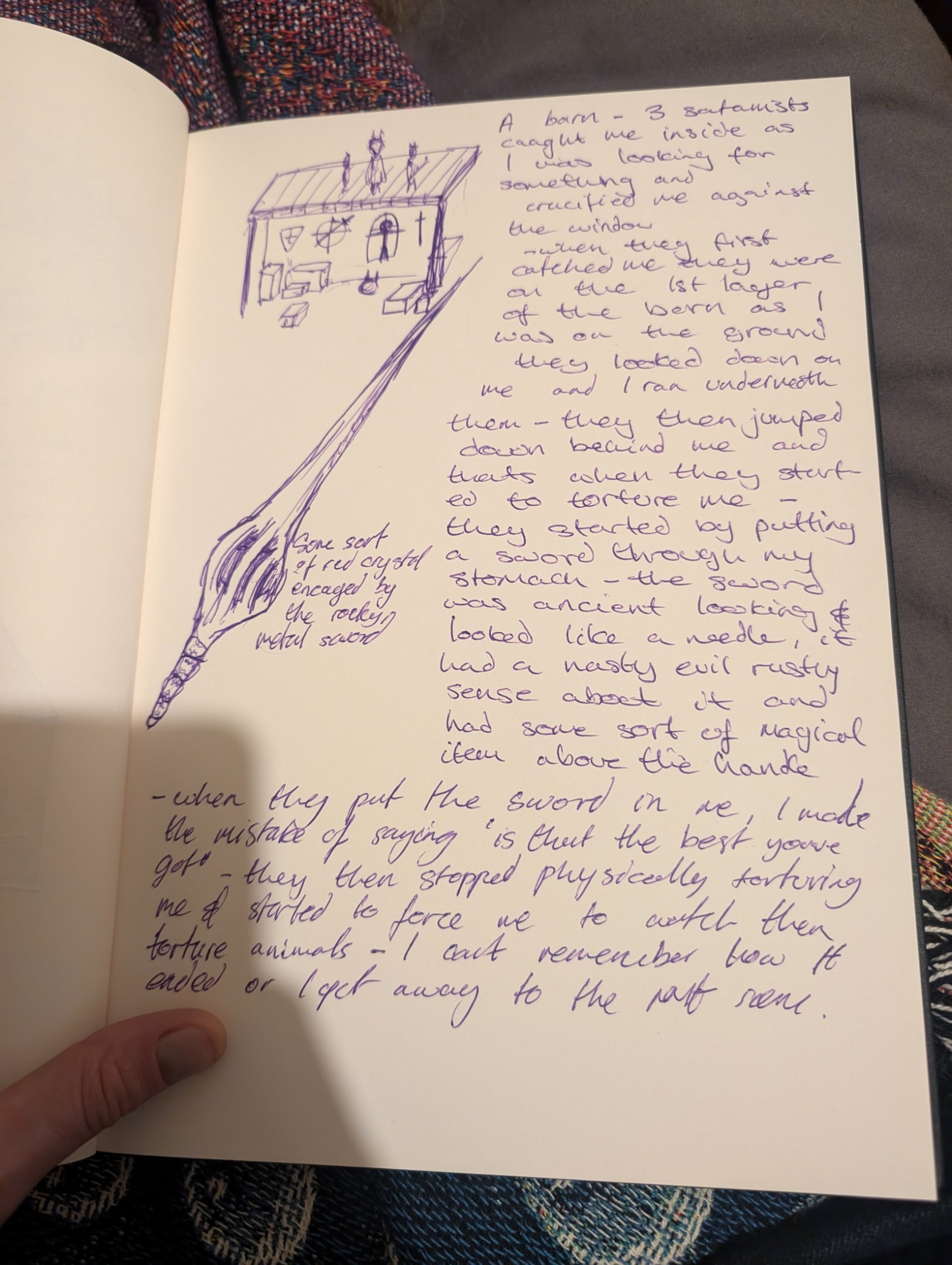 Before I knew it, I was crucified and pinned to the wall of the barn, two torches of fire either side me on the wall and distorted daylight trickled through the barn in a glitching manor. Bauta and the demons gleamed with sadistic intention stipulated through my capture and crucifixion. Swiftly, they opened a small portal to which they pulled a sword out of, the sword was old, rusty and decrepit, it held the shape of a long needle with a domed hilt that contained a fiery red gemstone. Be not mistaken, this was a ritual sword that their order had been utilising for centuries in accordance to the black magicians nefarious objectives. They took this sword and put it through me, right to the domed hilt containing the ruby gem, I felt it, a hole, a void formed inside of me to cater for the space the sword demanded from my body. But I tell you one thing, when you face these fuckers, you face them, you look them in the eye and you give them no fear, no pain, no suffering, nothing for them to feed on, you make their actions the result of their failings and you shine a light on that and reflect it to them. However in this instance, my ego had gotten the better of me and I wanted to shit on them, so I looked them in the eyes, chuckled, and said, “is that really all you've got, I expected more”. They turned and gazed at each other, realising the nature of their failings and the consequent humiliation that their actions had led to, and realising that they would be unable to torture me through means of physical scrutiny, resulted to means that they only used as a last resort as conducting these means was energy consuming and draining upon them, they opened a portal to the black lodge and were pulling energy directly from the lodge in order to torture me, they took a live cat, and forced me to watch as they tortured the cat with physical pain.